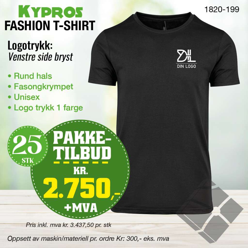 Vår populære fashion t-skjorte selges i pakkeløsning på 25 stk ferdig med logo trykk på venstre side bryst.