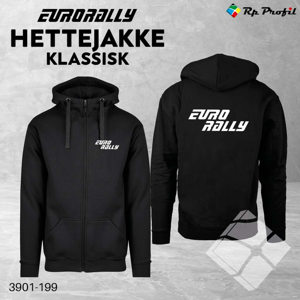 EURORALLY klassisk unisex hettejakke med hvit logo trykk på venstre bryst og rygg.