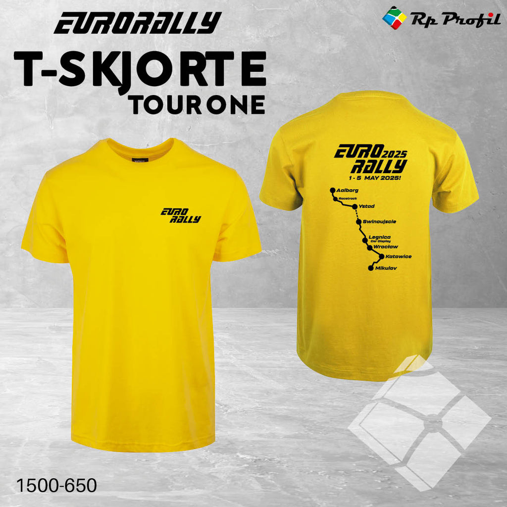 EURORALLY "on tour" t-skjorte med sort logo trykk på venstre bryst og TOUR ONE kart og logo på rygg.