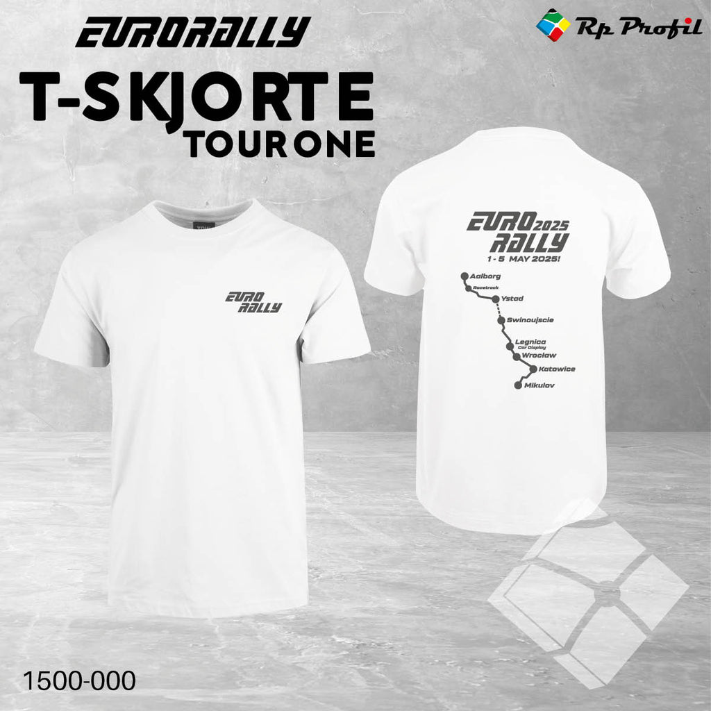 EURORALLY "on tour" t-skjorte med sort logo trykk på venstre bryst og TOUR ONE kart og logo på rygg.