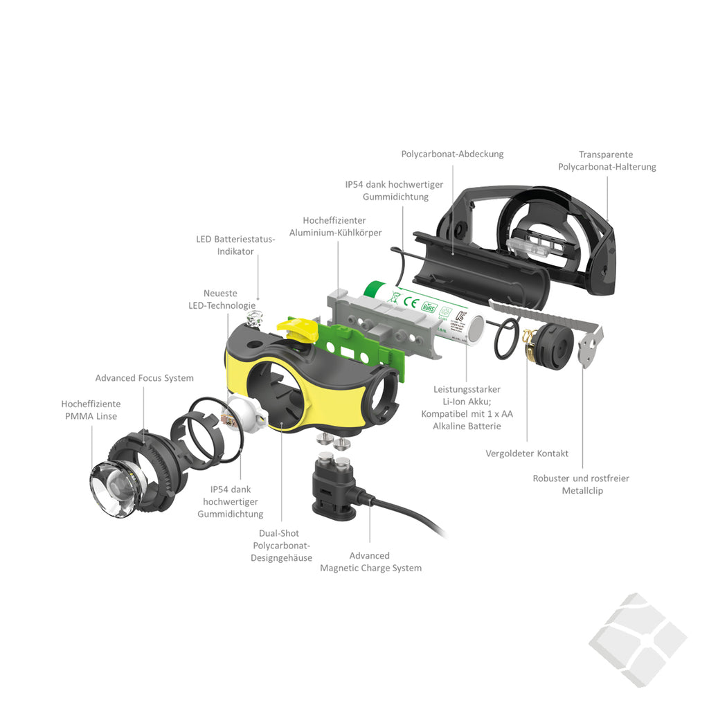 Hodebåndet har silikon på innsiden for at det skal sitte godt, både på hjelmen og på hodet. Det følger også med et hjelmfeste med lim på baksiden dersom du ønsker å feste lykten på hjelmen. Lykten kan enkelt klipses av hjelmfestet og lades i med ladekabelen som festes med magnet.